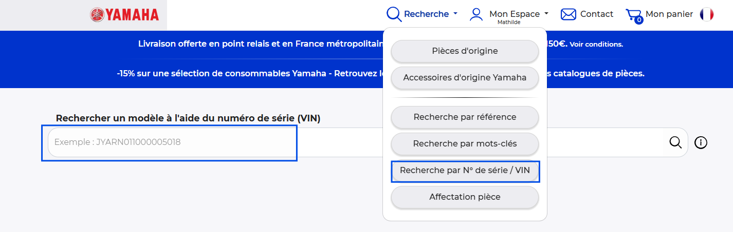 Une fois le numéro VIN trouvé, saisissez-le dans la barre de recherche : "Recherche par numéro de châssis/VIN" pour identifier le modèle exact de votre véhicule. Vous pouvez ensuite sélectionner votre moto dans la liste pour accéder aux microfiches et passer votre commande sans risque d"erreur.